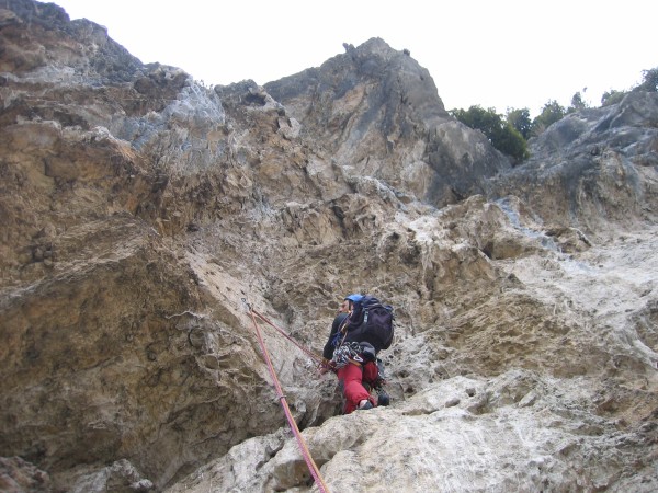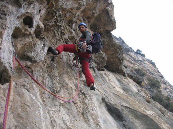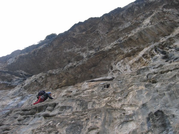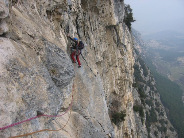- Lunghezza 6, VI/VI+: dritti leggermente a sx della sosta, verso un fix, quindi traversare decisamente a sx, arrivando a roccia più ammanigliata da risalire, per poi traversare a dx per diversi metri fino alla sosta.