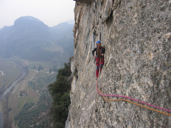 Roccia stupenda, soprattutto nei tiri superiori, dove la qualità è veramente sopra la media della Valle del Sarca (almeno rispetto alle vie classiche).