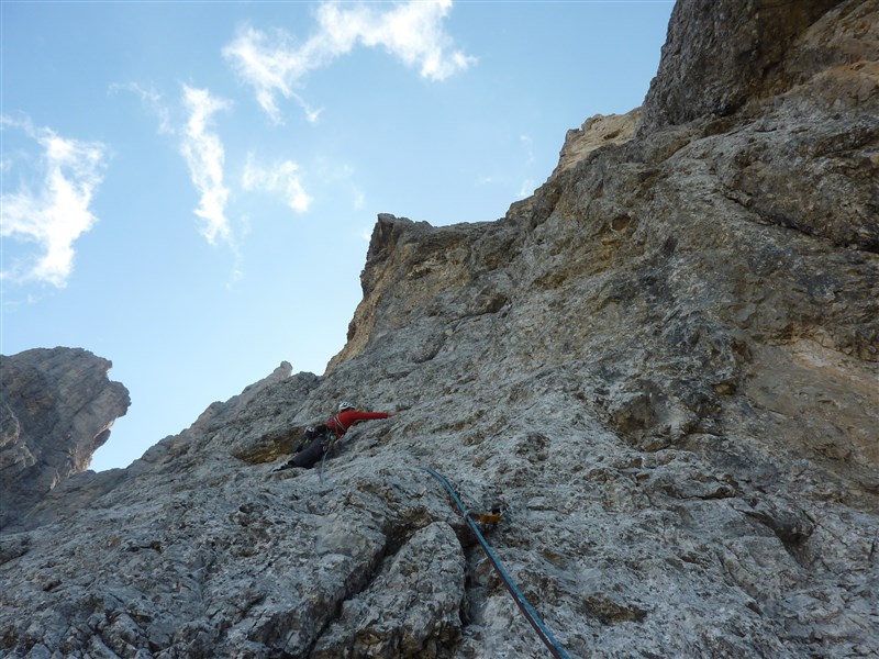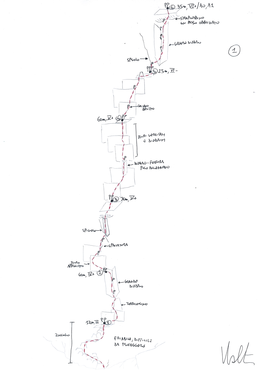 - Lunghezza 6, VI+ e A0, A1, 35 metri: doppiare lo spigolo di destra (passaggio non facile) e traversare verso un grande diedro. Ora salire il diedro (chiodi, ma spesso distanziati, che obbligano a passi duri) e raggiungere uno strapiombino, protetto poco sotto. Uscire con qualche passo obbligato, arrivando ad un comodo ballatoio, sosta su due chiodi.
