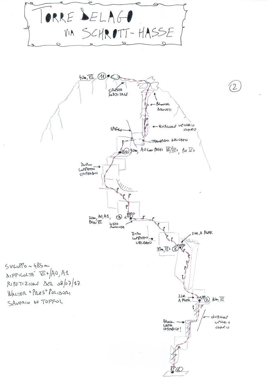 - Lunghezza 11, VI, 40 metri: su per muro compatto con buona roccia (chiodo), andando poi a destra in corrispondenza di un chiodo. Si arriva ad un muro verticale tecnico non protetto, da attraversare verso destra, a raggiungere un diedro con chiodi e qualche vecchio cuneo. Si sale il diedro, arrivando ad una zona più rotta con massi a cui fare attenzione. Salito questo tratto, si arriva sotto la crestina sommitale, con grossi massi; si raggiunge la cresta scegliendo la roccia più stabile. Ora andare brevemente verso sinistra e arrivare al culmine della crestina, dove si sosta su spuntone cordonato.