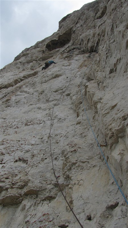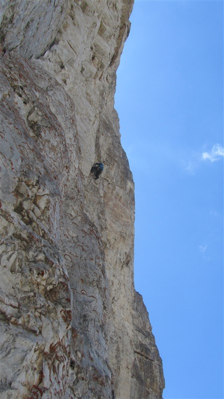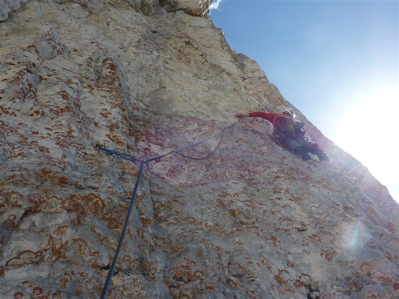 - Lunghezza 4, V+, 60 metri: noi siamo saliti verso sinistra, a raggiungere una zona più rotta e fessurata, per poi obliquare verso destra e salire alla sosta. E' errato: in questo modo ci sono molti attriti e la roccia è molto brutta. Il tiro invece dovrebbe salire dalla sosta per muro, andando a raggiungere una fessura-diedro verticale in alto a destra, poco accennata. La si sale e si raggiunge un chiodo, dove si potrebbe organizzare una sosta, da rinforzare. Consigliato invece continuare per muro verticale e diedrini, fino a raggiungere la sosta più in alto, su due chiodi.