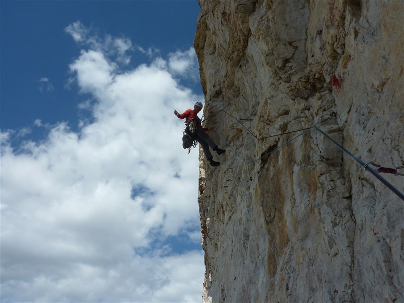- doppia 1 verso la forcella tra la Torre Delago e la Torre Stabeler. Si evita una sosta intermedia a 20 metri circa e si scende fino ad una grande cengia. Qui, traversando a sinistra (faccia a monte) si trova una sosta inox con catena (circa 40 metri);