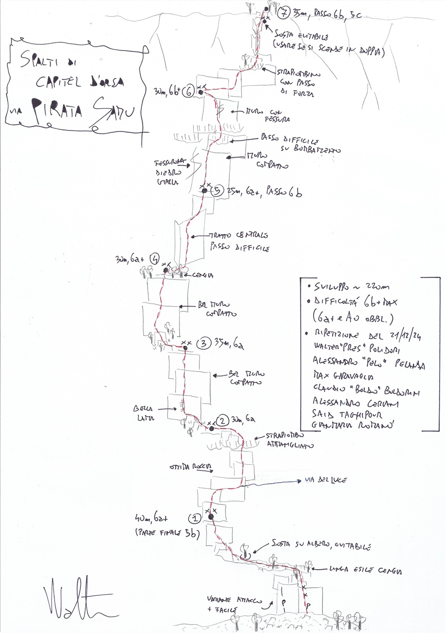 - Aggiornamento: relazione a cura di Walter Pres Polidori, da una ripetizione del 21 dicembre 2024 con Alessandro Pelo Pelanda e le cordate Max Garavaglia, Claudio Boldorini e Alessandro Ceriani, Said Taghipour, Gianmaria Romanò.