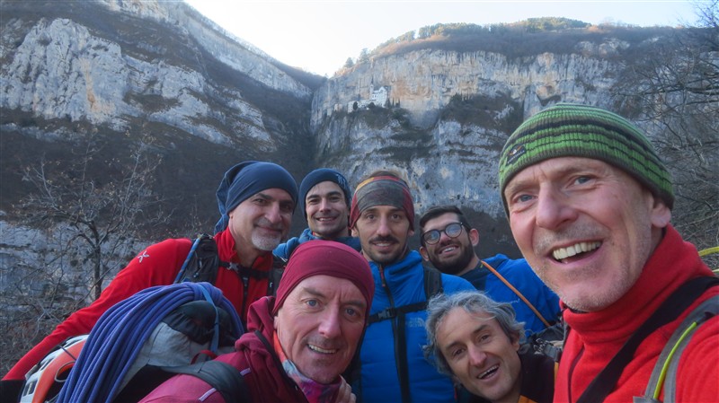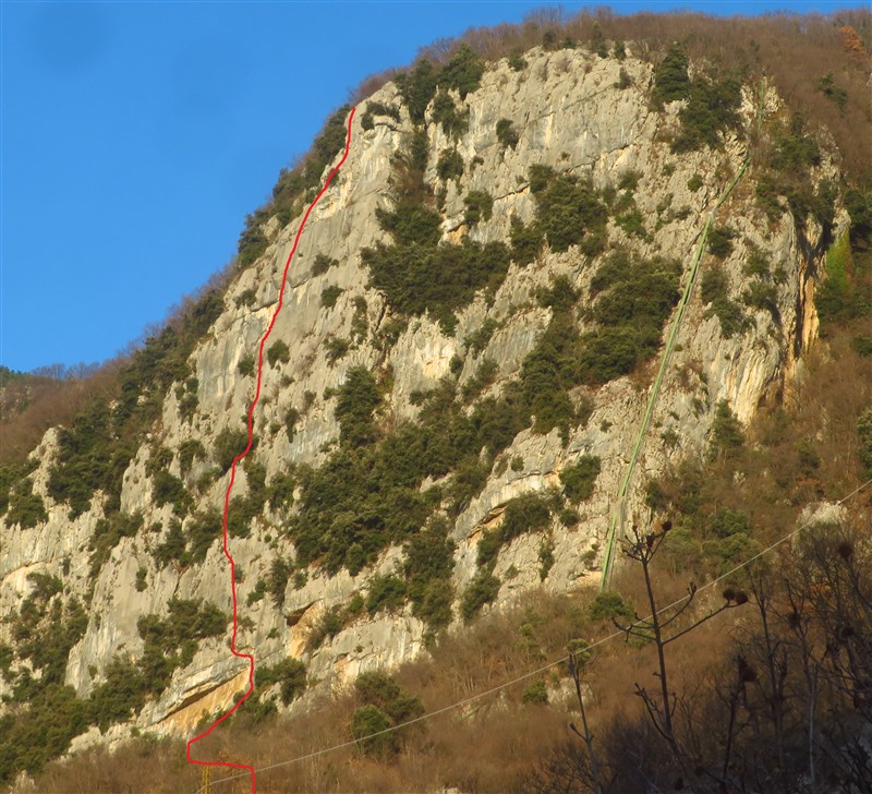 - Note: bella via, con alcune lunghezze davvero meritevoli. Purtroppo la prima lunghezza e alcuni brevi tratti presentano molta vegetazione. Il posto selvaggio, con continua vista sulla Basilica della Madonna della Corona, merita molto.