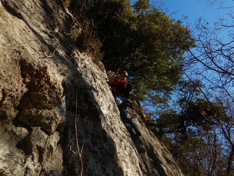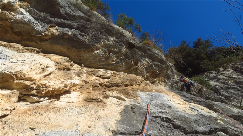 - Lunghezza 4, 6a+, 30 metri: salire verso sinistra tra rocce e vegetazione, arrivando ad un muro compatto molto bello. Salire il muro, concatenando alcune lamette provvidenziali, fino alla sosta dietro alcuni alberi.