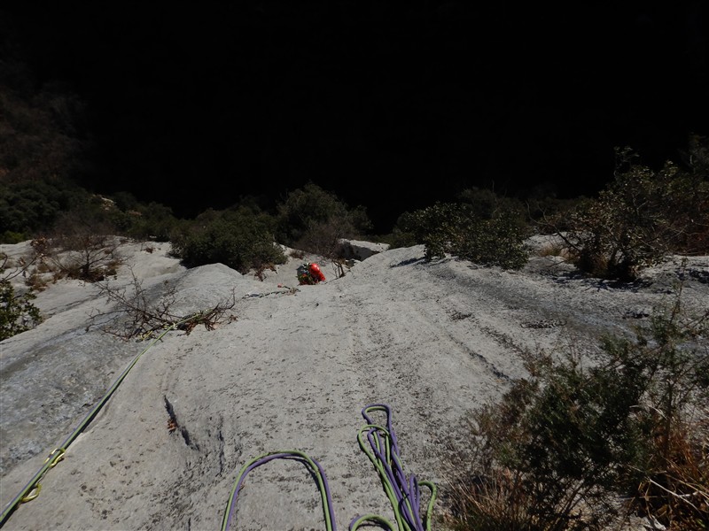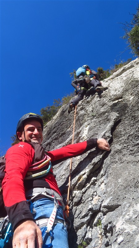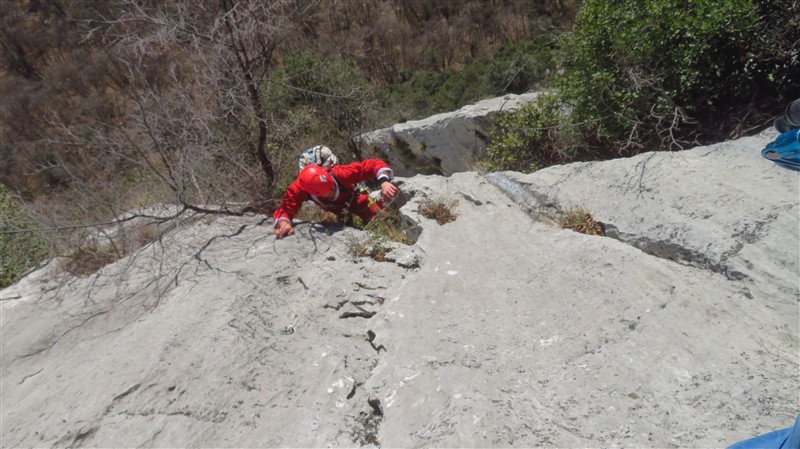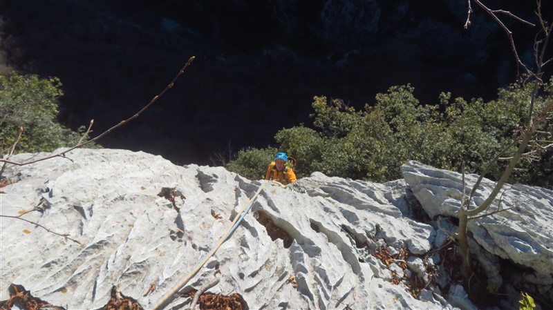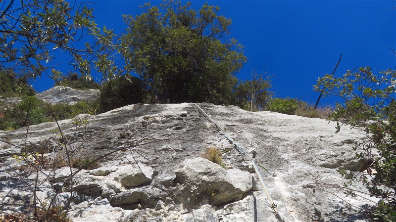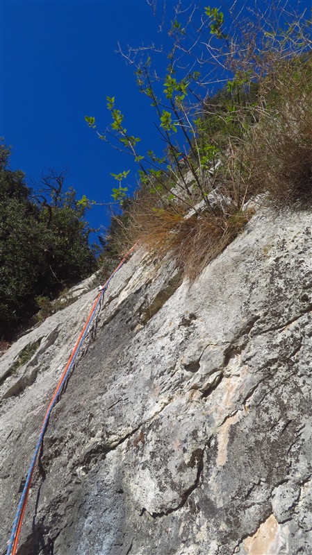 - Lunghezza 3, 6a, 35 metri: salire a sinistra su roccette e vegetazione, fin sotto un bel muro (lama iniziale super) da salire direttamente.