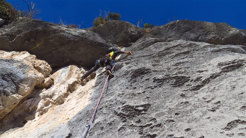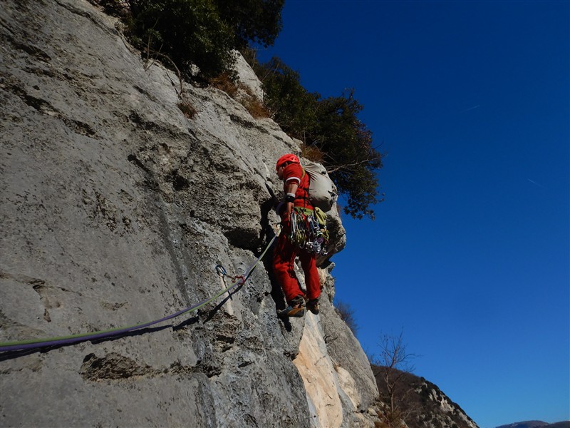 - Attrezzatura: soste attrezzate con fix, alcune con catene, l'ultima sosta su albero. Sui tiri fix. Friend non indispnesabili ma utilizzabili in qualche punto.